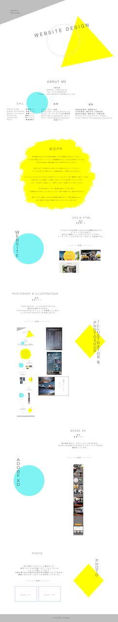 HTMLとCSSを使用しWebsiteを構築するまでの コーディングができます。 現在はSassを利用し、効率的い作業を進めれるようにしています。 常にレスポンシブ対応できるよう意識してサイト制作をしていて、 直近で作成した3つのサイトはレスポンシブ対応しています。 またJqueryを使用し動的なサイトも作成しています。 現在は一週間に1ページを目安により効率的なSassの書き方、 Javascriptの知識を勉強中です。